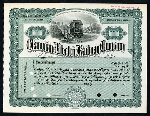 Washington. Odd Shares Specimen Capitol Stock. Black ink with ornate green border and under print. Vignette of electric inter-urban train over bridge. "Not to be removed from file" overprints and POC's. XF condition with light toning on top margin. Rare Washington state stock. Unlisted railroad in Cox. SBNC.
