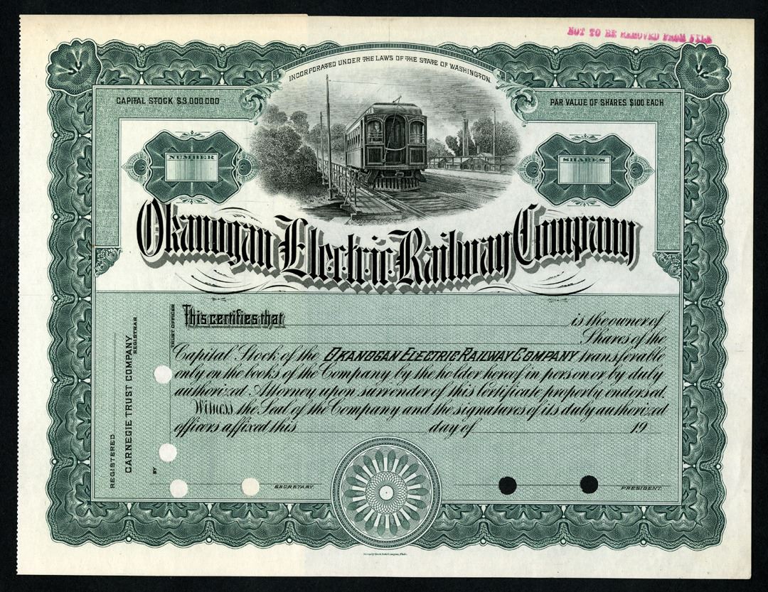 Washington. Odd Shares Specimen Capitol Stock. Black ink with ornate green border and under print. Vignette of electric inter-urban train over bridge. "Not to be removed from file" overprints and POC's. XF condition with light toning on top margin. Rare Washington state stock. Unlisted railroad in Cox. SBNC.