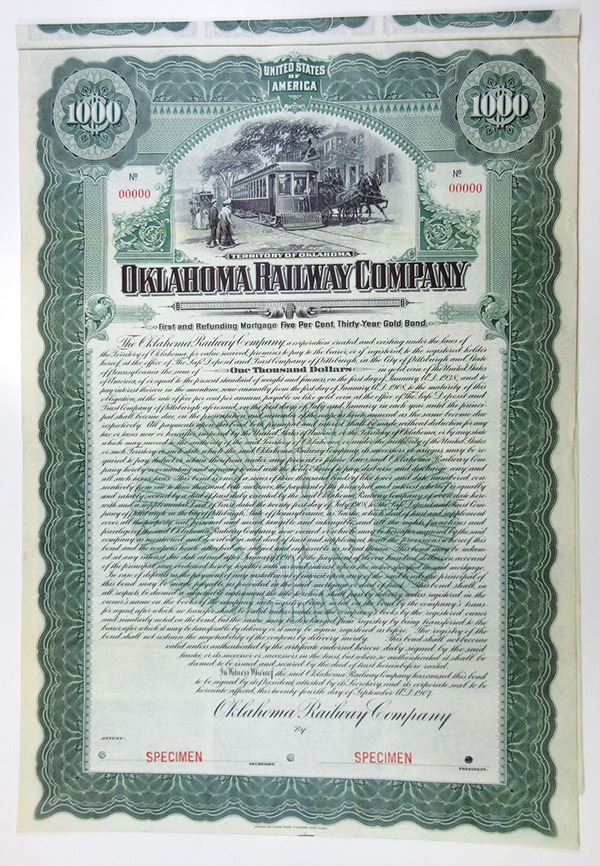 Territory of Oklahoma. $1,000 Specimen 5% 1st & Refunding Mortgage Gold Coupon Bond, Black print on ornate border and under tint, Electric railcar passing horse and buggy at top and people walking in street, Specimen overprints and POC's, VF-XF condition, ABNC.