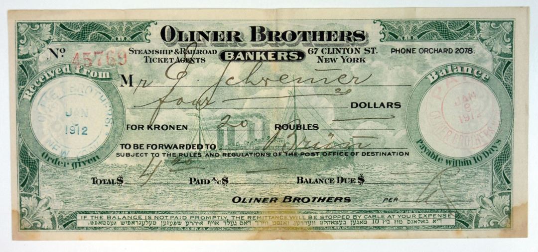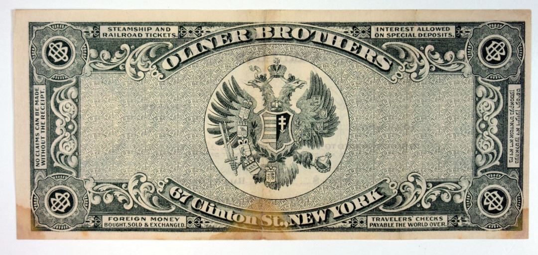 New York, NY. Issued receipt for 20 Kronen = 4 Dollars, by Oliner Brothers, who operated as steamship and railroad ticket agents as well as a foreign exchange service. Hand stamped 1912. Text in English and in Hebrew. Choice Fine to Very Fine with minor staining.
