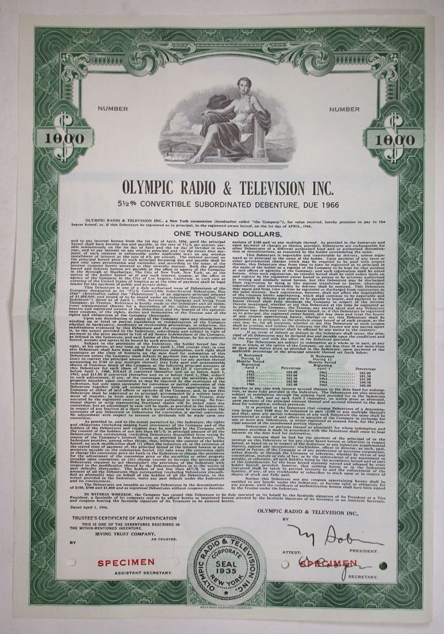New York, 1956. $1000 Specimen 5 1/2% Convertible Subordinated Debenture Coupon Bond, Black print on green border and underprint, Allegorical woman reclining at top, Specimen overprints and POC's, VF-XF condition, SBNC. Early Television manufacturer.