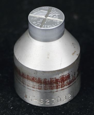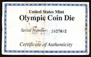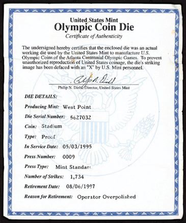 West Point, New York, 1995-97. $5 Gold Obverse Proof Coin defaced with large "X", Die has S/N 5627032, In service date of 5-3-1995 and retirement date of 8-6-1997, Made 1,734 strikes, Press #9, Die was retired due to operator over-polishing, Lot includes certificate of authenticity and the small leather pouch it came in. Attractive commemorative coin collateral.