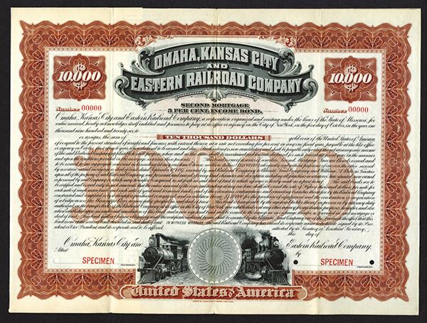 Missouri. 1896. $10000 5% Specimen Bond. Black print with brown border and underprint. Two approaching locomotive bottom center. POC's and red SPECIMEN overprints. VF condition with minor splitting. ABNC. Unlisted railroad in Cox.