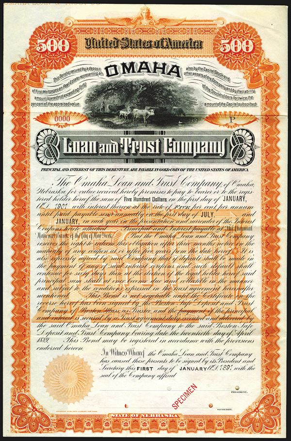 Nebraska. $500 Specimen 5% 1st Mortgage Gold Coupon bond. Orange border. Pastoral scene with cows. Red specimen overprints, POC's and "00000" serial numbers. VF condition. Rare and attractive banking related bond. ABNC.
