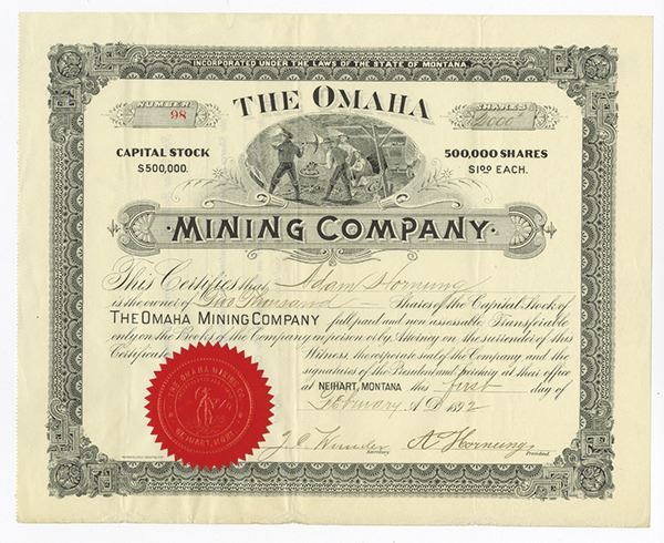 Montana, 1892. 2000 Shares I/U Capital Stock Certificate #98, Black text with black border, Men at work in mine at top center. XF condition.