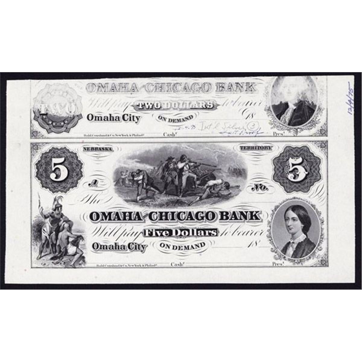 Omaha City, Nebraska Territory, 18xx (ca. early 1860's), $5, (NE-65-G8), Native American “Progress” Vignette on lower left, young woman on lower right with Battle of Bunker Hill in middle, Proof printed in black with no underprints, back blank, printed on white planchetted paper with a portion of the upper note on top with large margins on the other 3 sides, Uncirculated to CU condition. Bald Cousland & Co. Scarce modern proprietary proof with notation “Int'l Silver” in pencil on top margin evidently referring to the ABN program where there would be a replica silver banknote with a reprint proof of the banknote to accompany it. This is not the paper it was printed on for the program and is rare in this format.