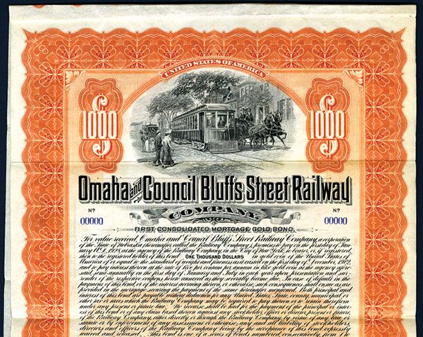 Nebraska. 1902. $1000 1st Consolidated Mortgage Gold Specimen Bond. Black print with orange border and underprint. Vignette top center of electric trolley with horse drawn carriage to it's left. POC's and red SPECIMEN overprints. VF condition. ABNC. Listed railroad and bond in Cox.