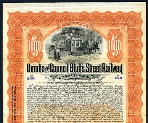 Nebraska, 1902, $1000, 5% 1st Consolidated Mortgage Gold Specimen Bond, Black on orange border and underprint, Electric trolley passing stagecoach top center, POC's red SPECIMEN overprints and blue s/n “00000 “, VF condition, ABNC. Blue overprint of extension of maturity notice and reduction in interest to 4%. Listed rare railroad and bond in Cox.