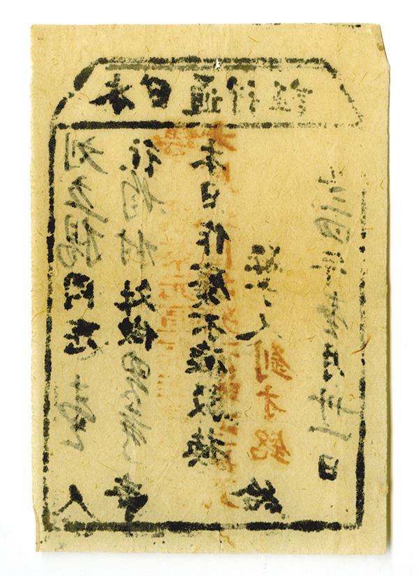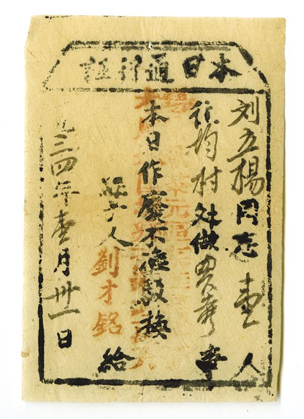 China, A one-day pass issued during China civil war era by the soviet government of China. The text translates to: "Comrade Liu Liyang, with a party of 1, is going to Juncun Village for pawning. This pass will expire by the end of day and no extension is allowed. Issued by Liu Caiming, Jan 31st 1934." A red seal of the local soviet government is present. XF condition. _________________________Ò____________________________________________Ó______________