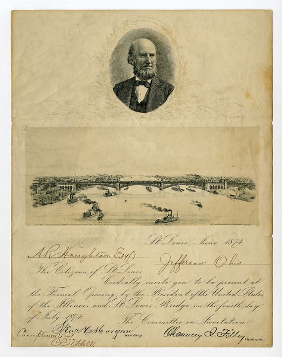 St. Louis, Missouri, and Jefferson, Ohio. 1874. Formal Invitation from the Citizens of St. Louis to A. R. Houghton Esq, of Jefferson Ohio, to the opening of the Illinois and St. Louis Bridge in July of 1874 that will be opened by the President of the United States, Ulysses S. Grant. Invitation has lithograph of bridge over Mississippi river at center and portrait of bridge engineer James B. Eads. The interior of the 4 page invitation has an extensive list of all of the participants involved in the opening of the bridge and the celebration event. The Illinois and St. Louis Bridge, also known at the Eads Bridge, was one of the first major steel bridges, featuring three large steel arches. The bridge significantly improved transportation between St. Louis, Missouri, and East St. Louis, Illinois, and marked a major advancement in engineering. It set a precedent for future bridge construction using steel. VF to XF condition.