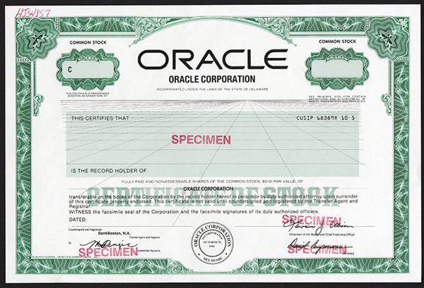 Delaware. Odd Shares Common Stock Specimen Certificate. Black print with green border and under print. No vignette on certificate, just company title at top. Specimen overprints, POC's, XF condition. SCBNC.