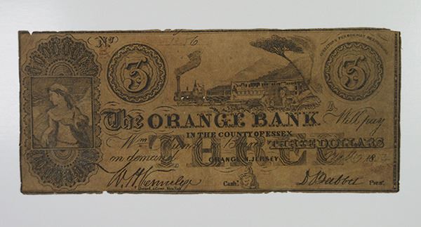 Orange, NJ. $3, 1854, Wait 1811, Haxby NJ 405 C-16, R-6. Appears like a primitive hand drawn note. VG, toned paper.