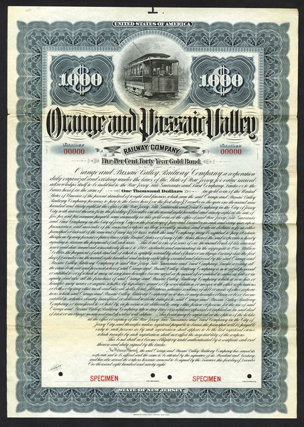 New Jersey. $1000 Specimen 5% Gold Coupon Bond, Black print on large steel gray border and under tint, Electric rail car at top, Specimen overprints and POC's, Fine condition with splitting along fold lines and coupons not attached, ABNC.
