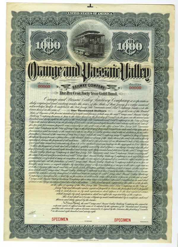 New Jersey. $1000 Specimen 5% Gold Coupon Bond, Black print on blue/gray border and under tint, Street railcar at top, Specimen overprints and POC's, Fine-VF condition with splitting along fold lines, ABNC.