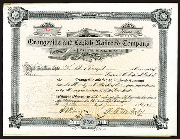 Pennsylvania, 1893, Orangeville & Lehigh Railroad Co. 3 Shares, $50 each, Stock Certificate, VF Condition. S/N 14.