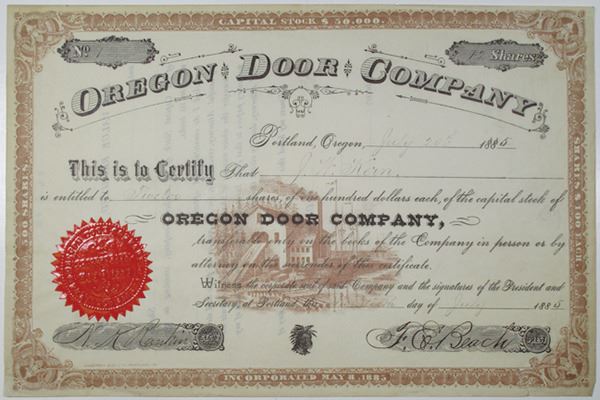 Oregon, 1885. 12 Shares I/U Capital Stock Certificate, Serial #1, Black text with brown border and undertint door factory on river in middle. VF condition. The Oregon Door Company manufactured doors, sash and moldings. First ever certificate issued by this company.