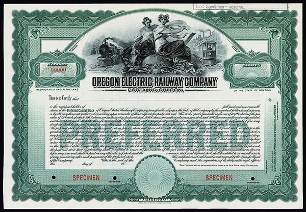 Oregon, 19xx (ca.1900-1920), Odd Shares, Specimen, Green border and underprint, allegorical seated women flanked by locomotive and streetcar. POC's, XF condition. ABNC.