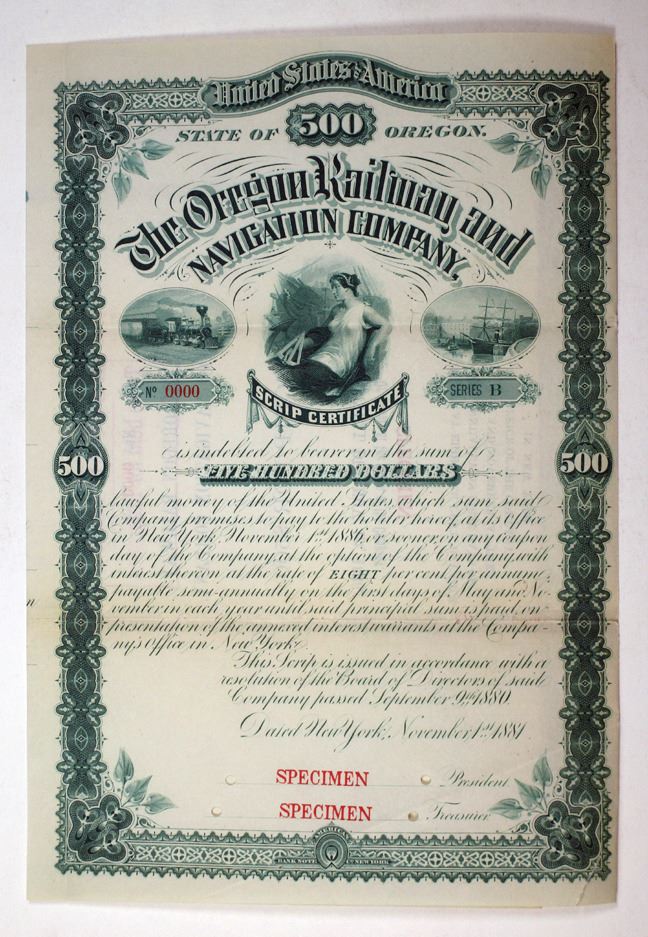 Oregon, 1880. $500 Specimen 8% Series B Script Certificate Coupon Bond, Green print and border with title at top and small vignettes at center, Specimen overprints and POCs, VF-XF condition, ABNC. Extremely attractive and rare bond.