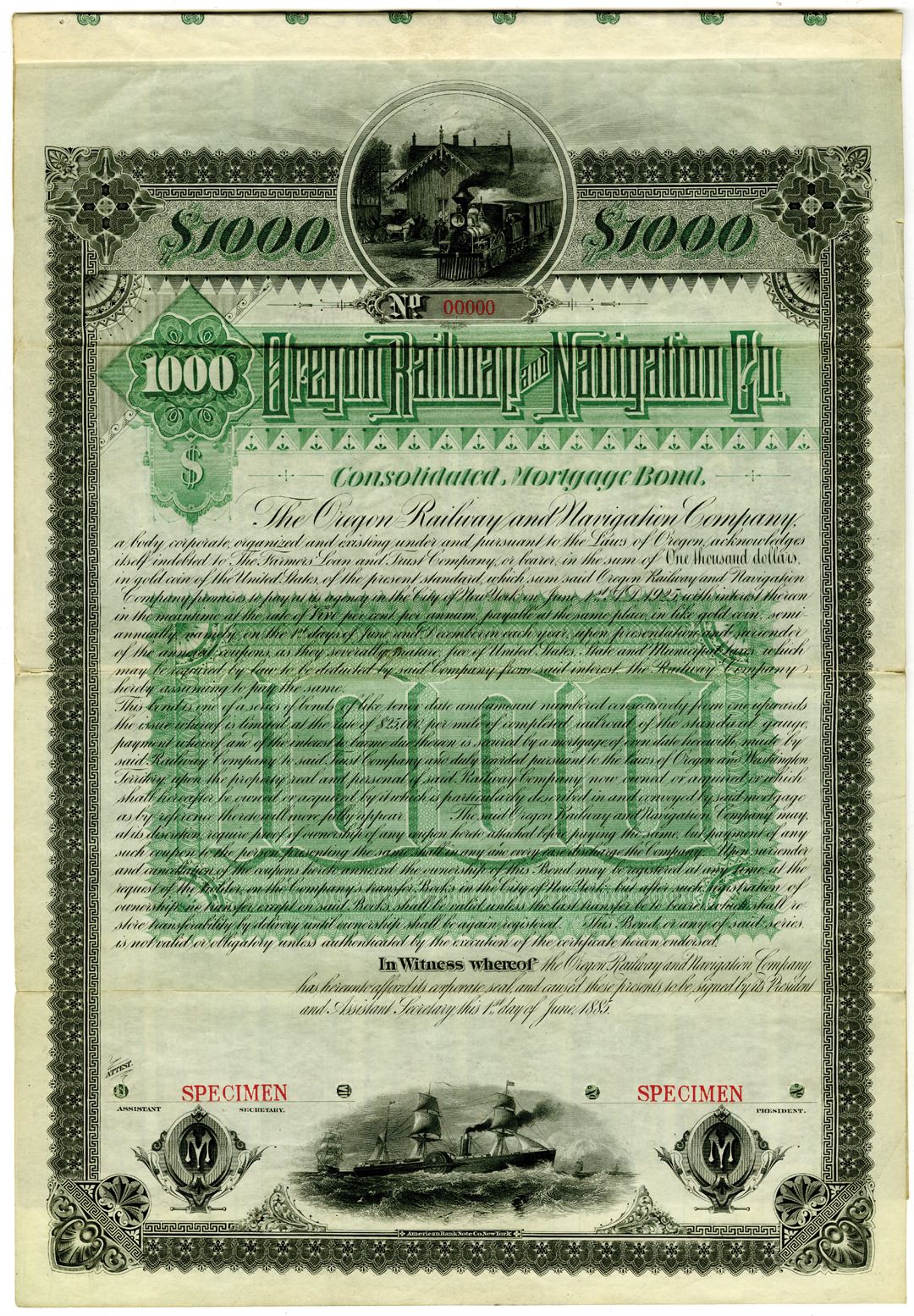 Oregon and Germany, 1885. $1000 Specimen 5% Consolidated Mortgage Coupon Bond, Black text with black border and green undertint, Train passing by building on tracks at top center. Each bond coupon overprinted on back in German, "Dieser Coupon einlosbar mit 105 REICHS MARK bei der Deutschen Bank, Berlin, (ihern Fillamen?) und dem Bankhaus Jacob S. H. Stern, Frankfurt am Main". Red specimen overprints, 00000 serial number, POCs. Fine condition, ABNC. Unlisted design and year in Cox. Unique example found in the ABN Archives and with very early Germany connection.