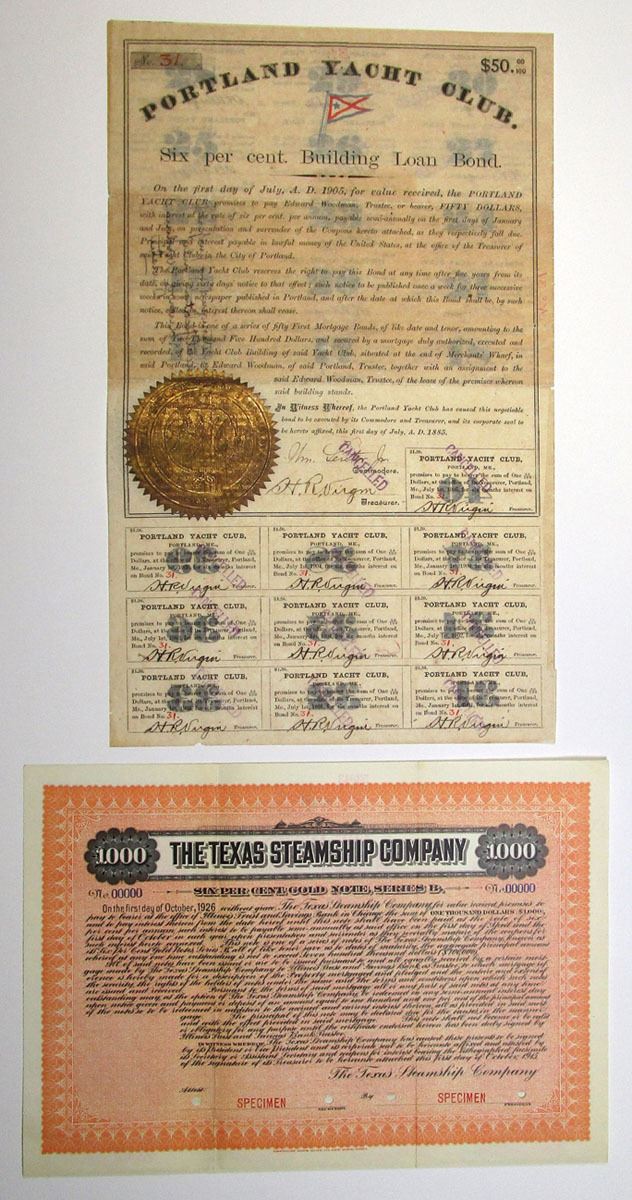 Oregon & Texas, 1885-1915. Lot of 2 Bonds, Includes: Portland Yacht Club, $50, I/C 6% Coupon Bond with flag top center and large gold seal bottom left; and, Texas Steamship Co. $1000, Specimen 6% Gold Coupon Bond, Specimen overprints and POCs. Bonds range from VF to XF condition. (2). Sold "AS IS" no returns accepted.