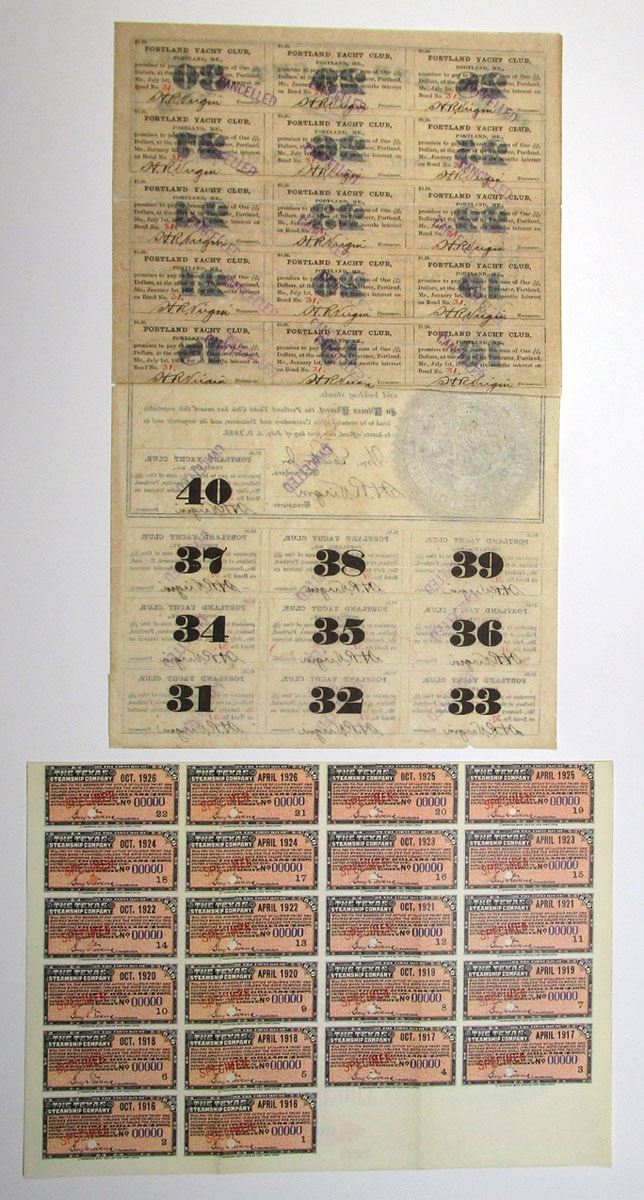 Oregon & Texas, 1885-1915. Lot of 2 Bonds, Includes: Portland Yacht Club, $50, I/C 6% Coupon Bond with flag top center and large gold seal bottom left; and, Texas Steamship Co. $1000, Specimen 6% Gold Coupon Bond, Specimen overprints and POCs. Bonds range from VF to XF condition. (2). Sold "AS IS" no returns accepted.
