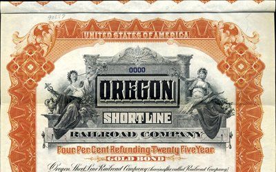 1904. $1,000. Specimen Refunding 4% Gold Bond. Orange border. Allegorical women flank title and Union Pacific shield on bottom border "The Overland Route". Red specimen overprints, POC's and "00000" serial numbers. Coupons attached. Rare certificate. Unlisted variety in Cox. Rare bond. IBNC.