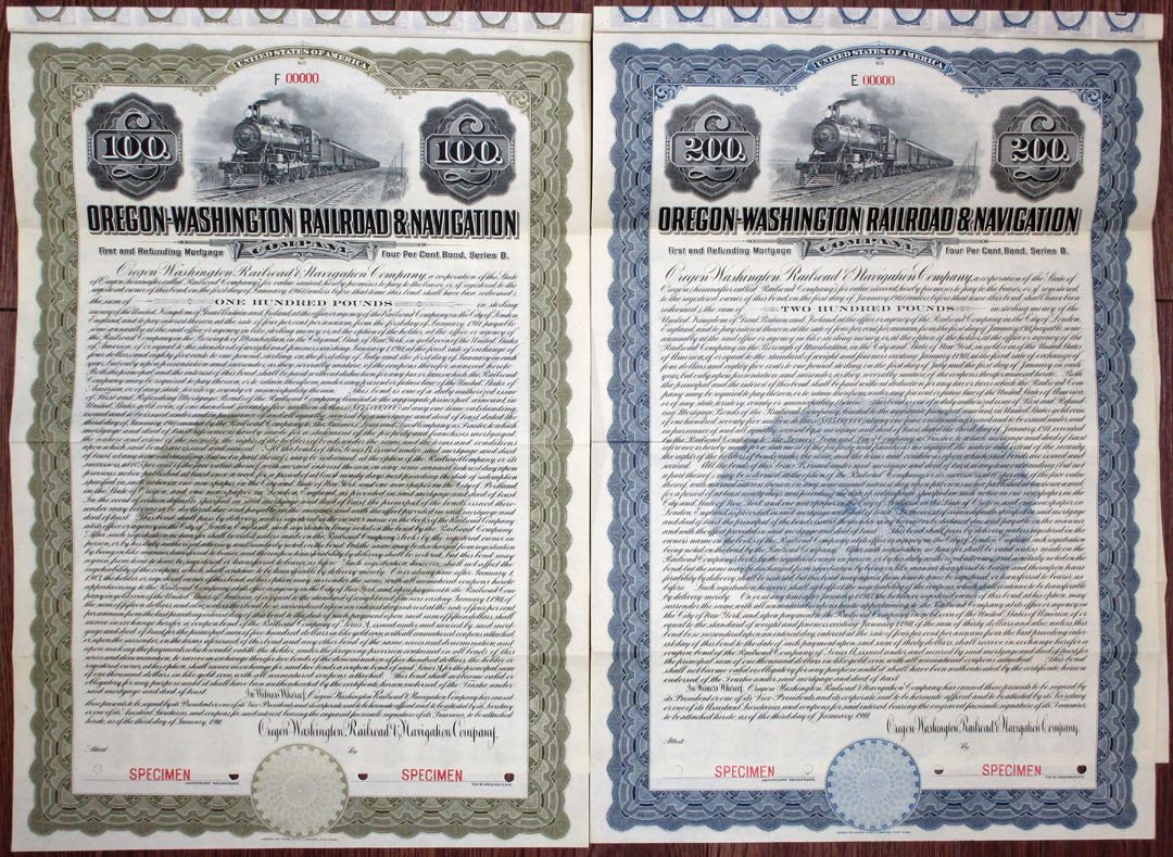 Oregon, 1911. Lot of 2 pieces, both are Specimen 4% First and Refunding Mortgage Coupon Bonds, Includes: 100 Pounds in olive and 200 Pounds in blue. Both have red specimen overprints, 00000 serial numbers, and POCs. VF to XF condition, ABNC. Both are unlisted denominations in Cox, Very Rare. (2)