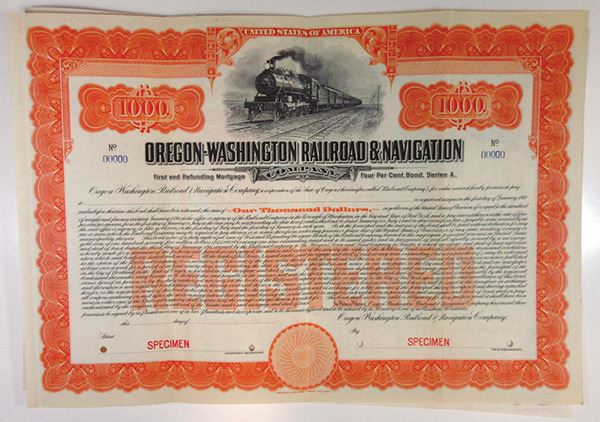 Oregon, 1911, Specimen $1000, 4% 50 year Registered 1st and Refunding Series A Mortgage Gold Bond, Black on orange border and underprint with speeding locomotive R-L on top middle, Specimen overprints, POC's, XF, ABNC. Listed bond type, unlisted color and denomination in Cox.