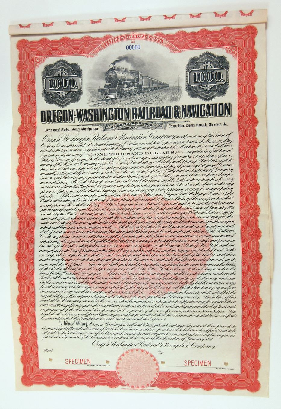 Oregon. $1,000 Specimen 4% Series A 1st and Refunding Mortgage Coupon Bond, Black print on red/orange border and under tint, Locomotive moving down tracks at top, Specimen overprints and POC's, VF-XF condition, ABNC. Only known as a specimen bond, no issued examples known.