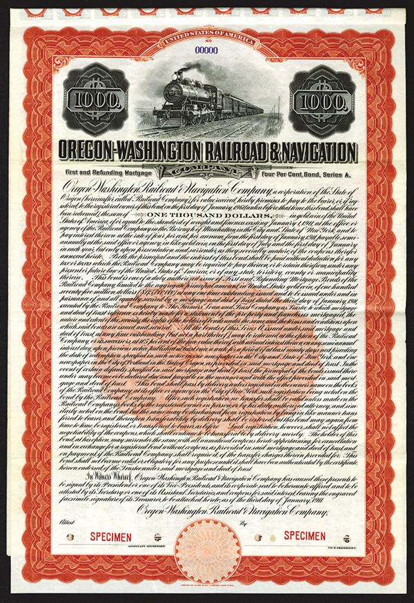 Oregon, 1911, $1000, Specimen 4% 50 year 1st Mortgage Gold Bond, Red border with locomotive vignette, Coupons attached, POC's, XF, ABNC.