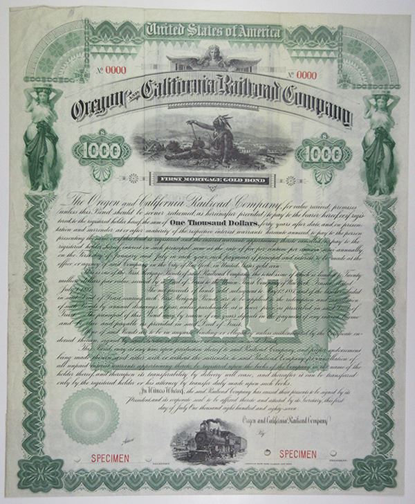 California and Oregon. $1,000 Specimen 5% 1st Mortgage Gold Coupon Bond, Black print on ornate green border and under tint, Native American looking out at top, small train at bottom, Specimen overprints and POC's, Fine-VF condition, ABNC