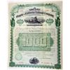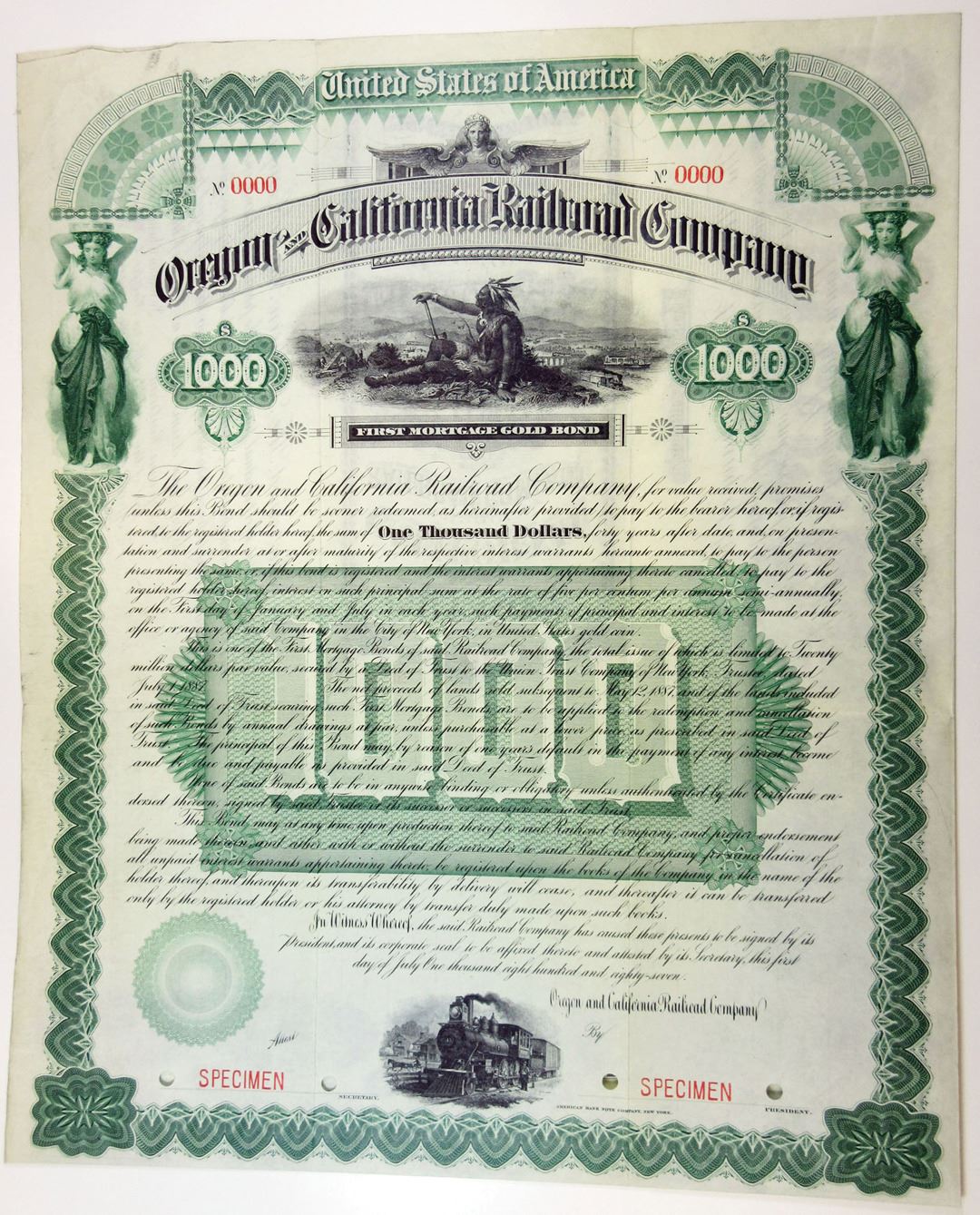 California and Oregon. $1,000 Specimen 5% 1st Mortgage Gold Coupon Bond, Black print on ornate green border and under tint, Native American looking out at top, small train at bottom, Specimen overprints and POC's, Fine-VF condition, ABNC