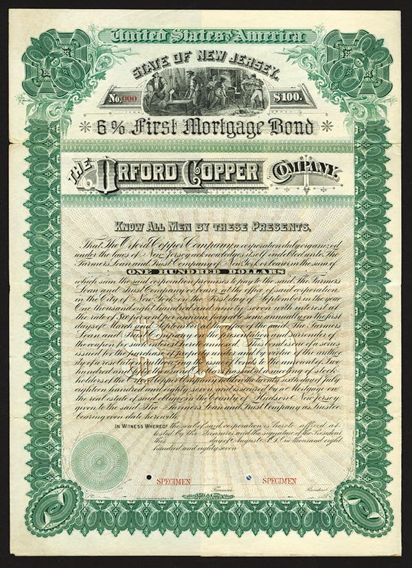New Jersey, 1887. $100 Specimen 6% First Mortgage Coupon Bond, Black text with green border and brown undertint, Men at work in mine at top center. Red specimen overprints, 000 serial number, and POCs. Fine condition, HLBN.