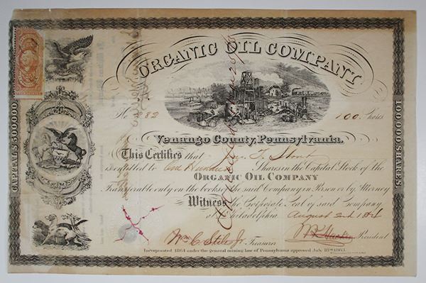 Pennsylvania, 1864. 100 Shares I/C Capital Stock Certificate, Black text with black border, Men at work in oil field at top center. Fine condition with toning throughout.