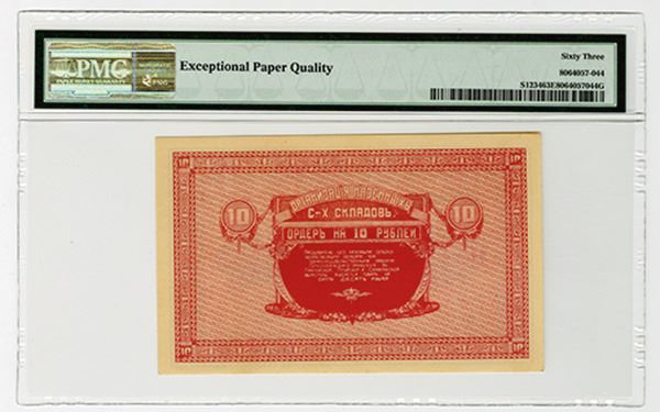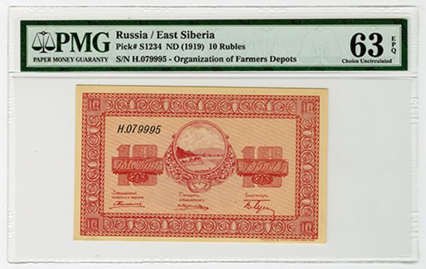 East Siberia, Russia. Issued 10 Rubles, ND (1919), P-S1234. PMG graded Choice Unc 63 EPQ.