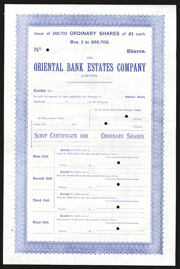 London. Specimen scrip certificate for ordinary shares, blue frame. This company was formed in order to invest in properties primarily in Ceylon and Mauritius. EF.