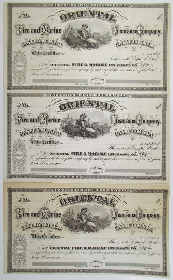 San Francisco, CA. Lot includes 3 pieces, all the same: Odd Shares U/U Capital Stock Certificate, Black text with black border, Man with hookah reclining on pillow with pyramids in background at center. All three are Fine-VF condition. The Oriental Fire & Marine Insurance Co. was incorporated in 1869. (3)