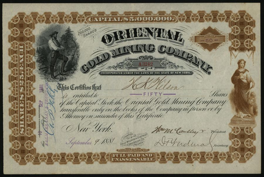 New York, 1881, 50 Shares, Issued Stock, Black on brown border and underprint, Man standing with pick axe top left, VF condition, ABNC.