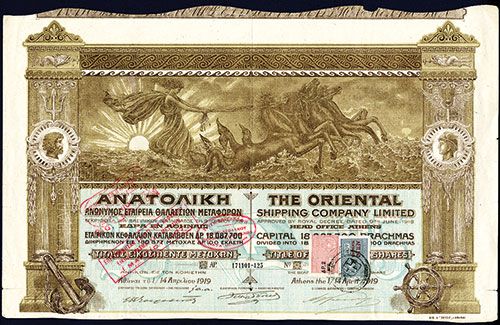 Greece, 1919, 100 Drachmas, Issued Bond, Greek mythological figure riding waves while holding the reins of three Sea-Horses, VF condition.