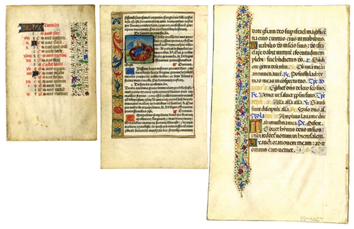 Europe......, 1470-1530. Lot of 3 original illuminated manuscript leaves, each richly decorated and likely dating from the medieval to early Renaissance period. These pages are written by hand on vellum (animal parchment) and feature illuminated initials, marginal embellishments, and script in Latin. Left markings feature intricate floral borders with gold accents, Text is in blackletter style script which was common in European manuscripts from the 12th to 17th centuries, All three feature Rubrication - Red and Blue capital letters used to highlight different sections. XF to AU condition. (3). Sold "AS IS" no returns accepted.