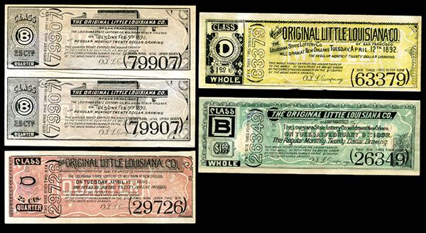 Original Little Louisiana Co. (of San Francisco), 1892 Lottery Ticket Assortment. Lot of 5 tickets. New Orleans, Louisiana, 1892 (5 including an uncut pair) issued Lottery tickets in various ticket amounts Classes, Series, colors and dates issued. The Original Little Louisiana Co. issued these in San Francisco, California for the Lottery in Louisiana. Includes Quarter and whole tickets, VF-XF condition with a few showing mounting remnants. All of the tickets state on the back that the prizes will be paid in U.S. Gold. Attractive, colorful and scarce Lottery Ticket assortment.