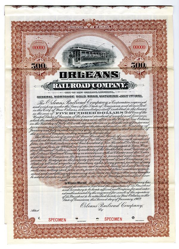 New Orleans, LA. $500, Specimen 5% Gold Coupon Bond, Black on brown border and underprint, Electric Street car at top, Specimen overprints, POC's, VF. ABNC. Rare bond. Only 3 found in ABN Archives.