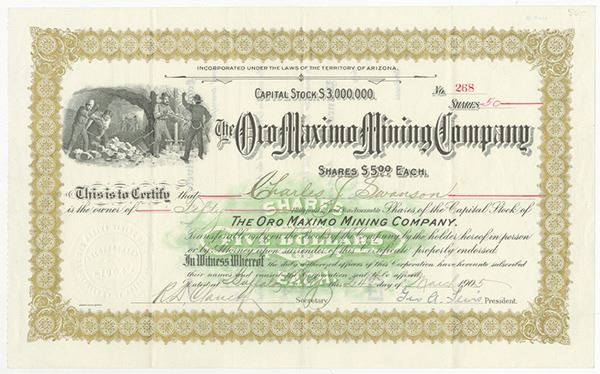 Mexico and Arizona, 1905. 50 Shares I/U Capital Stock Certificate, Black text with gold border and green undertint, Men at work in mine at top left corner. XF condition. Calvert Lith, Detroit