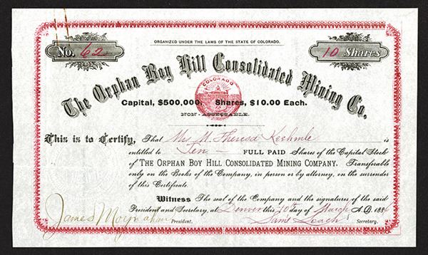 Colorado, 10 Shares, I/U, Stock certificate, Black with red border, S/N 62, VF with paper clip rust on top left. Scarce.