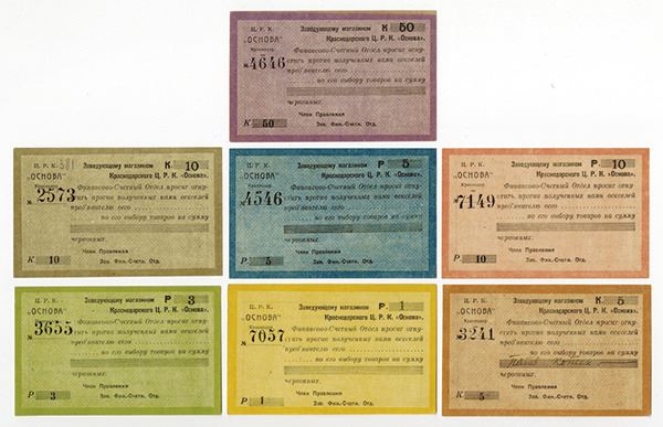 Krasnodar, Kouban, Russia. Lot includes 7 different notes from the same issue, 5, 10, and 50 Kopeks as well as 1, 3,5, and 10 Rubles. Extra Fine to Uncirculated.