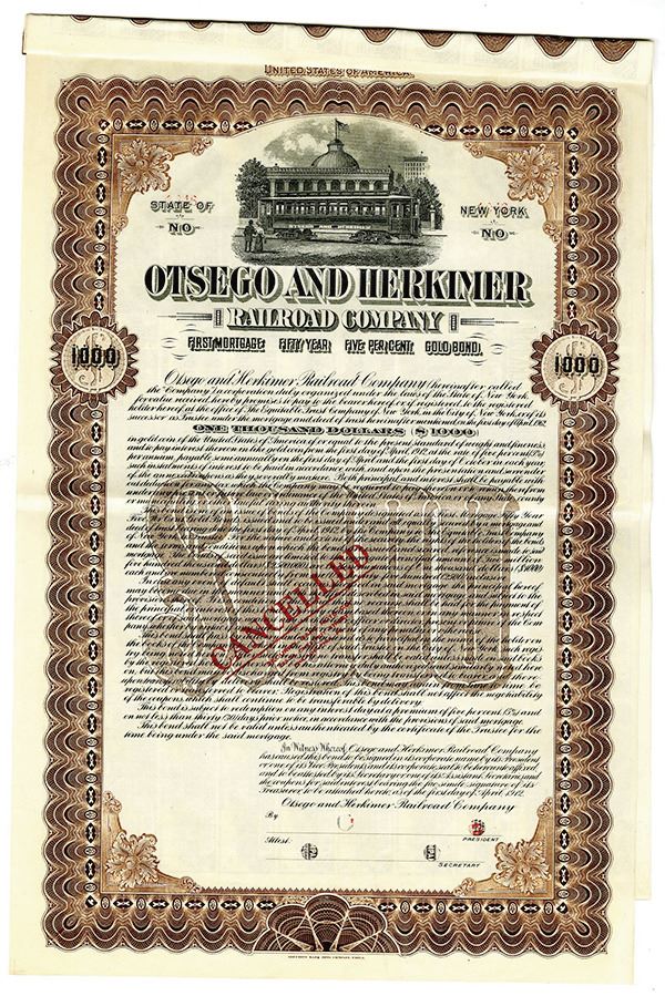 New York. $1000 Specimen 5% 1st Mortgage Gold Coupon Bond, Black print on brown border and under tint, Street car passing government building at top, Specimen overprints and POC's, VF-XF condition, SBNC.
