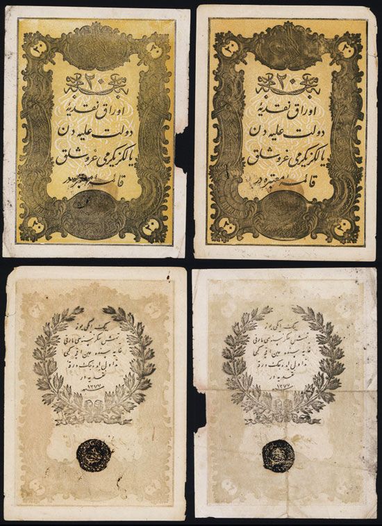 Lot of 2 notes, Turkey, AH 1277 (1861), both are 20 Kurush, P-36 Issued banknotes, black on gold underprint, One would grade XF with rounded corner and a small 1/3rd inch tear on the upper right side, the second would grade Fine with edge faults but there is a 1 inch piece of margin missing that does not touch the design on the right middle, still scarce early pair of Turkey banknotes.