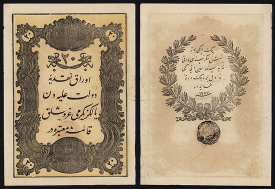 Turkey, AH 1277 (1861), 20 Kurush, P-36 Issued banknote, black on gold underprint, AU condition with a small 1/3rd inch tear on the right middle border that is difficult to see, still scarce early Turkey banknote. Also included is a 1928 menu from the Hotel-Restaurant M. Tokatlian - Constantinople in French and Turkish, the menu offerings look very appetizing.