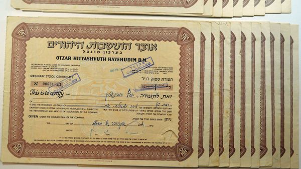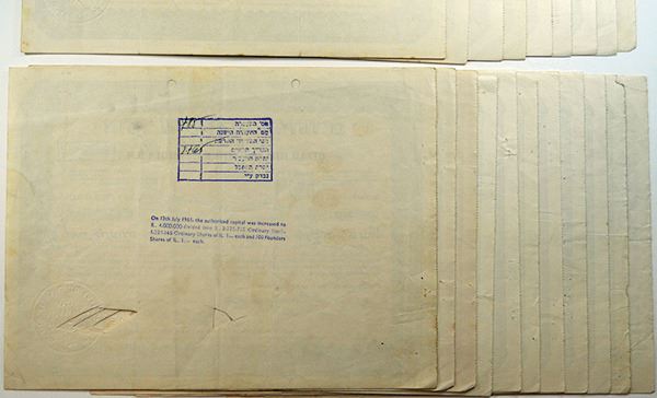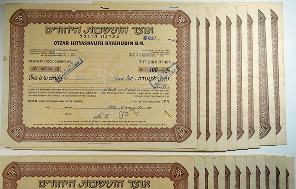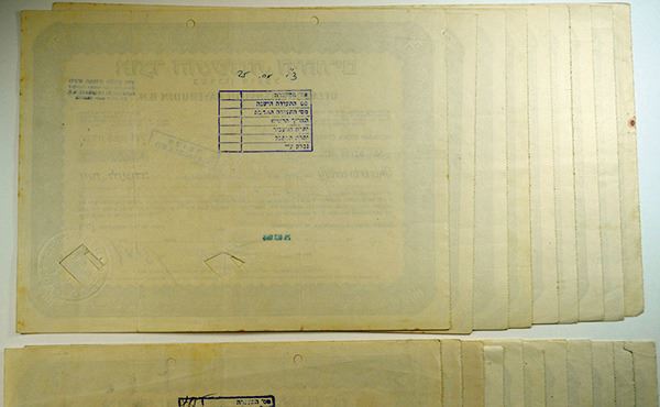 Israel. Lot of 20 I/C certificates with Punch Holes at top and are cut cancelled. (Also the signature areas may have cut outs.) Brown border with no vignette. Printed in English and Hebrew. VF/VF+ condition. 20 Pieces.