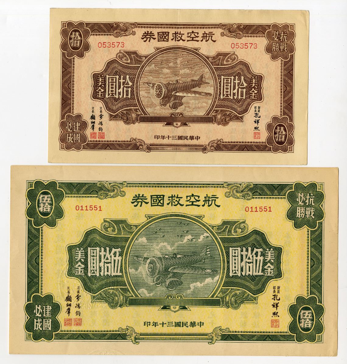 China...., 1941. Lot of 2 Overseas Chinese Patriotic Aviation Bond Issued in the Second Sino-Japanese War: $10 U.S. Dollars, S/M#H4-2, SB8132, Brown with pink underprint, S/N 053573 and $50 U.S. Dollars, S/M#H4-3 SB8133, Green on yellow underprint, S/N 011551. Notes range from AU to Uncirculated condition. (2). Sold "AS IS" no returns accepted. The Overseas Chinese Patriotic Aviation Bond was issued during the Second Sino-Japanese War (1937-1945) to raise funds for China's aviation sector, crucial in the fight against Japan. It targeted overseas Chinese communities, especially in Southeast Asia and North America, appealing to their patriotism. The funds helped purchase aircraft and support the Chinese Air Force. The bond campaign was successful, highlighting the strong ties between the Chinese diaspora and their homeland, and played a vital role in sustaining China's resistance against Japan during the war.